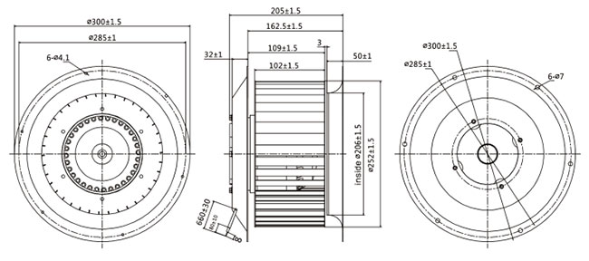 單進風(fēng)前傾式離心風(fēng)機根據(jù)風(fēng)機外形可分為蝸殼前傾式離心風(fēng)機和常規(guī)前傾式離心風(fēng)機兩種。蝸殼前傾式離心風(fēng)機共有120mm、133mm、140mm、150mm、160mm、180mm等六種,常規(guī)前傾式離心風(fēng)機有200mm、225mm、250mm、280mm、315mm、355mm、400mm、450mm等八種。