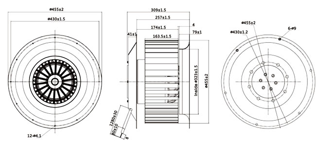 單進(jìn)風(fēng)前傾式離心風(fēng)機(jī)根據(jù)風(fēng)機(jī)外形可分為蝸殼前傾式離心風(fēng)機(jī)和常規(guī)前傾式離心風(fēng)機(jī)兩種。蝸殼前傾式離心風(fēng)機(jī)共有120mm,133mm,140mm,150mm,160mm,180mm六種風(fēng)機(jī)。常規(guī)前傾式有200mm,225mm,250mm,280mm,315mm,355mm,400mm,450mm八種風(fēng)機(jī)。